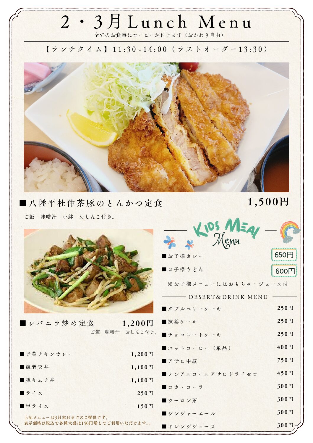 大人気の杜仲茶ポークとんかつ御膳、レバニラ炒め定食などの定食メニューに 野菜たっぷりのチキンカレーなど豊富なメニューでお客様をお迎えいたします。 全てのお食事おかわり自由のコーヒーが付いて大変お得なランチをどうぞご利用...