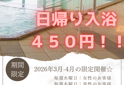 2月の日帰り入浴営業時間でございます。 時間規制が数日ございますので、事前にご確認いただきますようお願い申し上げます。
