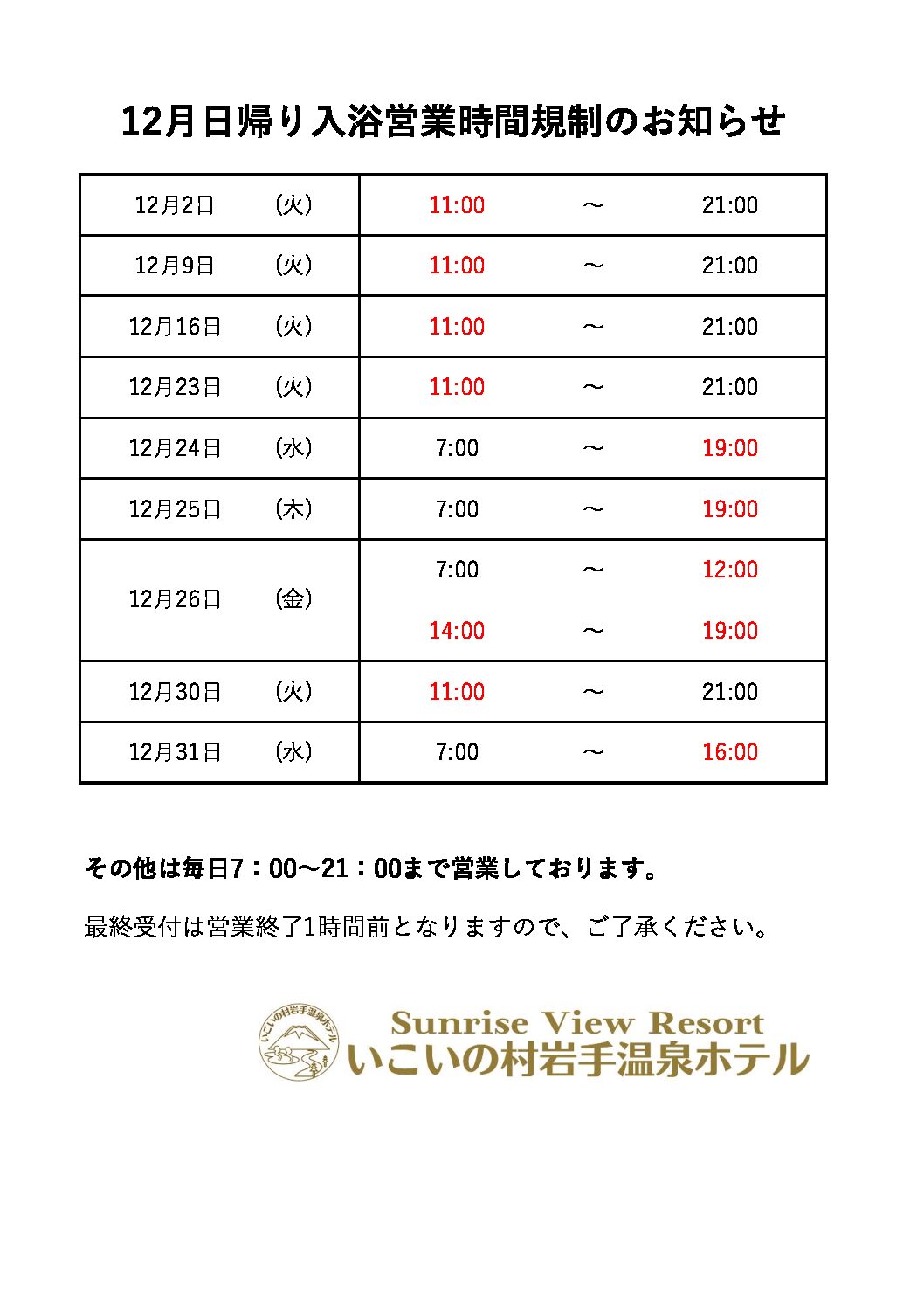 12月日帰り入浴営業時間のお知らせ 2025.11.30 12月の日帰り入浴営業時間でございます。 時間規制が数日ございますので、事前にご確認いただきますようお願い申し上げます。 Tweet Share +1 Hatena Pocket RSS feedly Pin it