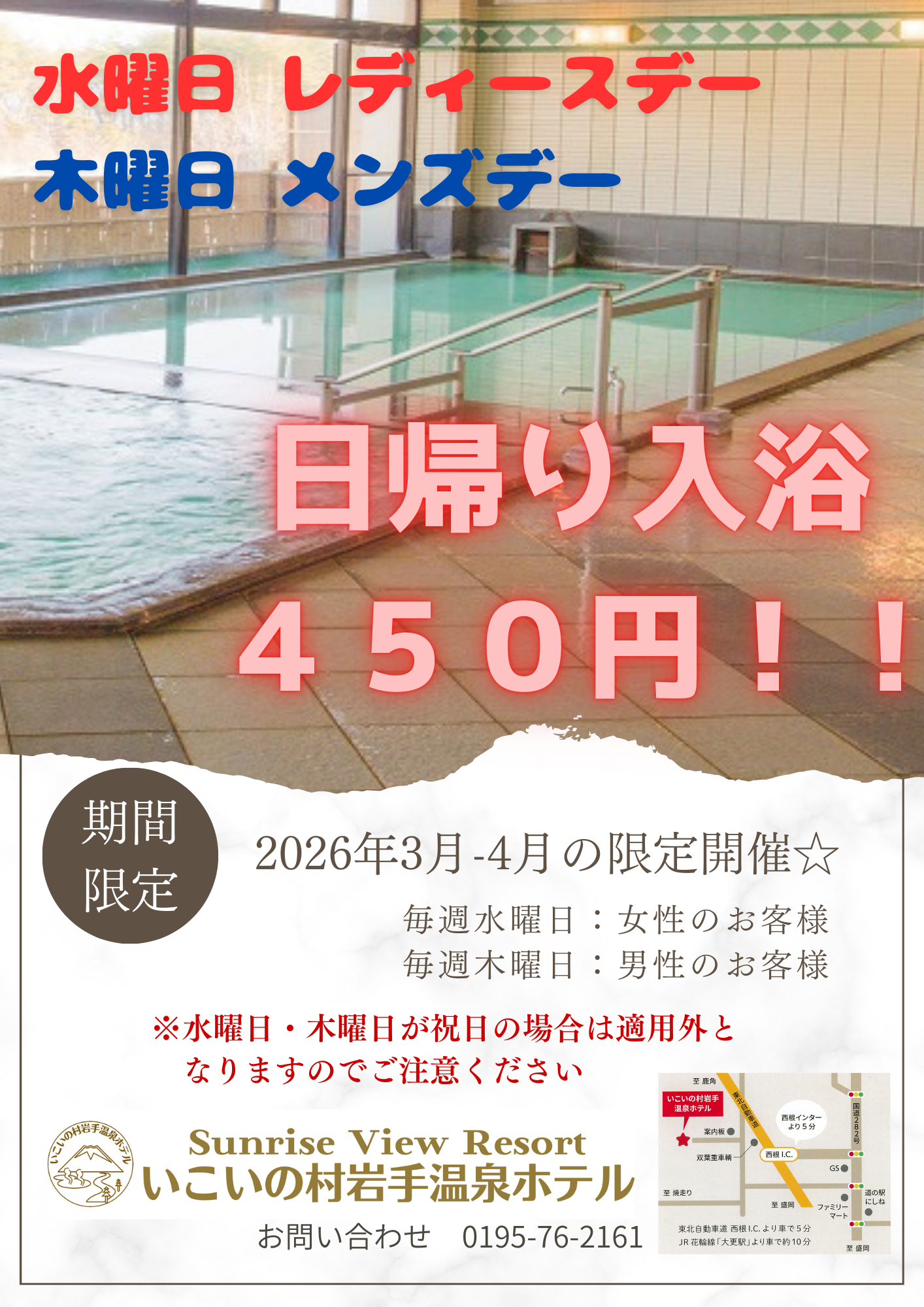 3月・4月限定!!日帰り入浴レディースデー・メンズデー開催☆